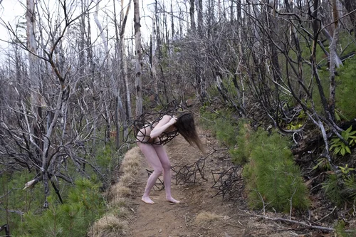 Participants were asked in advance to write thoughts about their understanding of "shyness" on a piece of paper. Then the group was led on a silent walk through the forest and into the dunes, all the while passing the slips of paper quietly between them. When they arrived at the site where i was naked and lying in a hole in the sand, they were led on the upper perimeter of the dune in a circle around me. They were asked to look at me indirectly or "just shy of" my performance. By seeing me in their periphery, it was my intention that they don't just witness a human figure, but a context- a shy gaze expanding their viewpoint into an interrelated perception of the vast the landscape, their own walking body, the people walking in front of them, and my isolated, vulnerable body below.